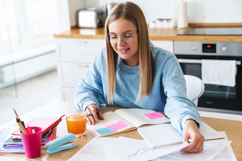 Depending on your home set-up, try to find a comfortable space to study where you can concentrate. If you have a desk, keep it tidy and well-lit. If you’re studying at the kitchen table, make sure to set up your space properly.