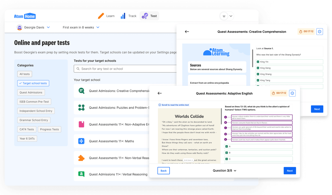 With Atom Home, you’ll have unlimited access to online and printable mock tests tailored to your target schools. Tests are marked instantly, with clear insights into your child’s progress — so they can walk into exam day feeling confident, calm and well prepared.