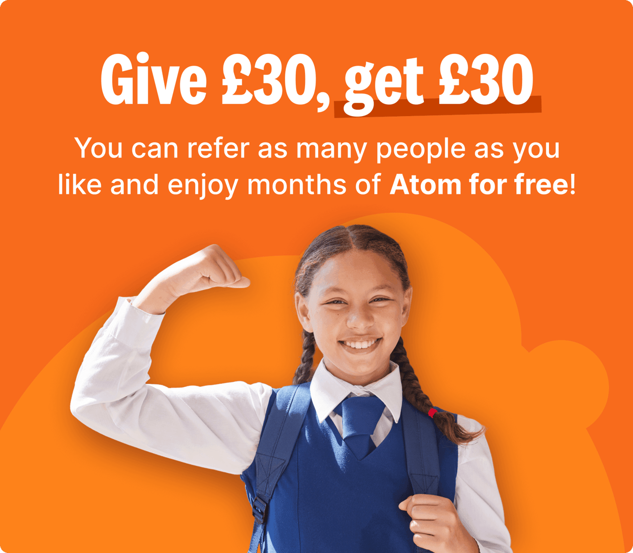 Refer a friend to Atom Home and you’ll both get £30 credit! Once your friend completes their free trial, you’ll receive £30, and they’ll get £30 added to their account too.