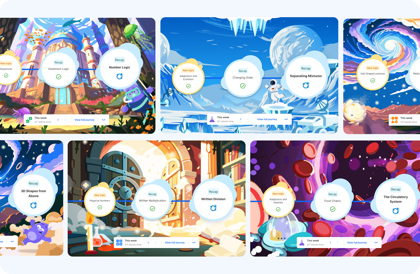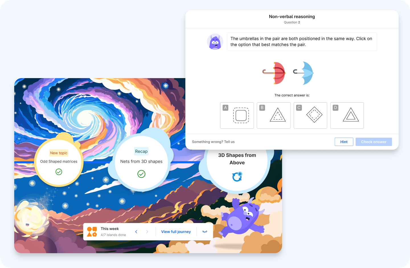 Atom's learning islands give you a concept-level map of your child's progress across every reasoning type. Not a general sense of how they're doing, but a clear picture of which question types are secure, which are developing, and what's coming next. For your child, the islands are something different entirely.