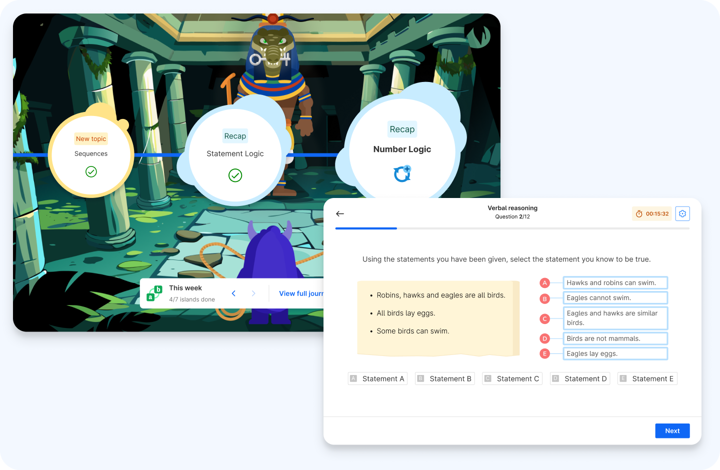 Each one is built around an engaging story and learning journey, making the process feel less like exam prep and more like an adventure. That visibility and engagement working together make it easy to see progress building, session by session.