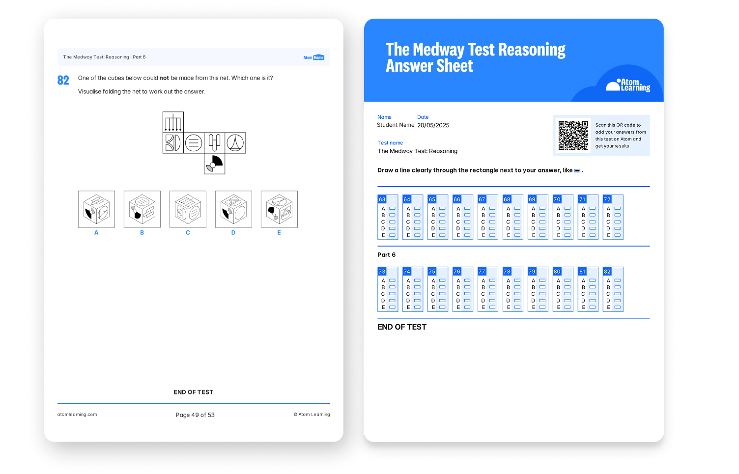 We've made marking easy for you, too. Simply photograph your child's answer sheets and upload them to Atom. The papers are marked instantly, showing your child's standardised age score (SAS), where they're doing well, and what they should focus on next. You'll also learn how they compare to other children applying to the same school.