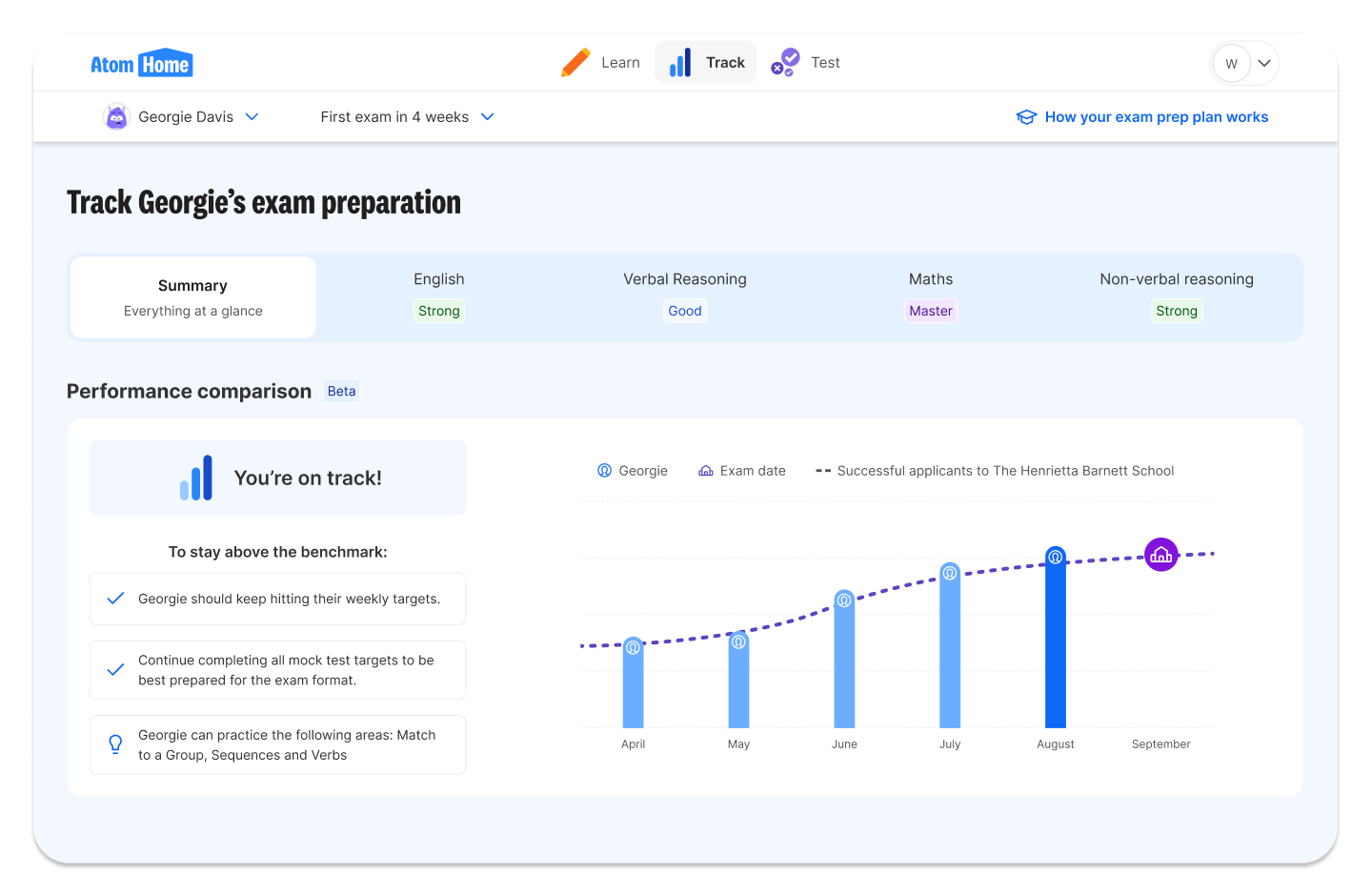 Not sure if your child is on track for the grammar school 11+? You don’t need to guess what to cover or whether they’re ready. Atom shows you exactly what to practise each week and how they’re performing, so you can stay ahead of the process without the stress.