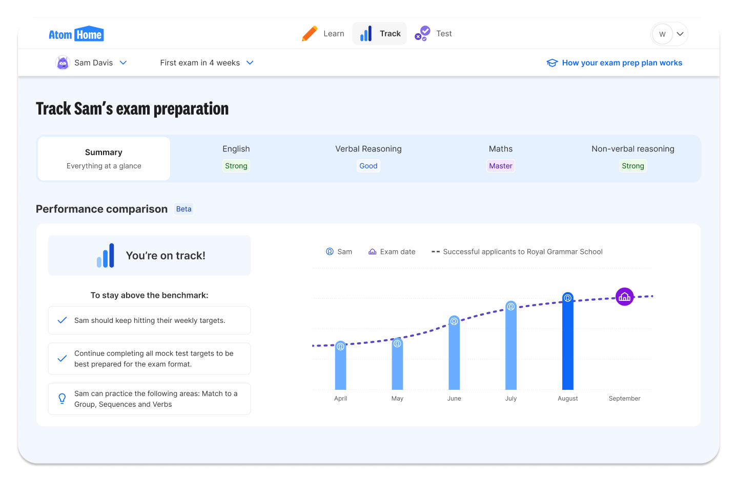 Not sure if your child is on track for the grammar school 11+? You don’t need to guess what to cover or whether they’re ready. Atom shows you exactly what to practise each week and how they’re performing, so you can stay ahead of the process without the stress.