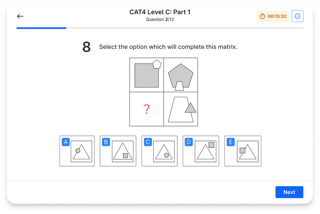 Unlike curriculum-based tests, the CAT4 focuses on a child's natural reasoning ability. It's a non-adaptive test, which means every child answers the same questions in the same order.