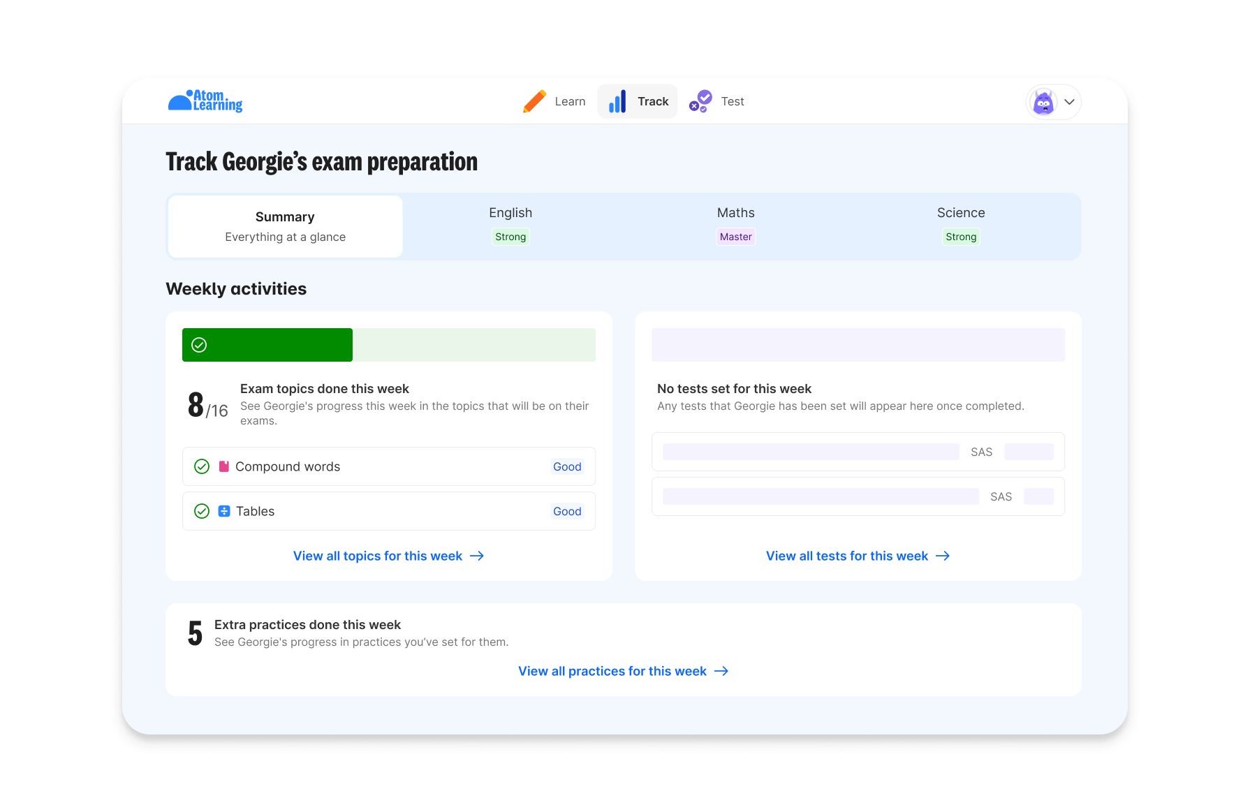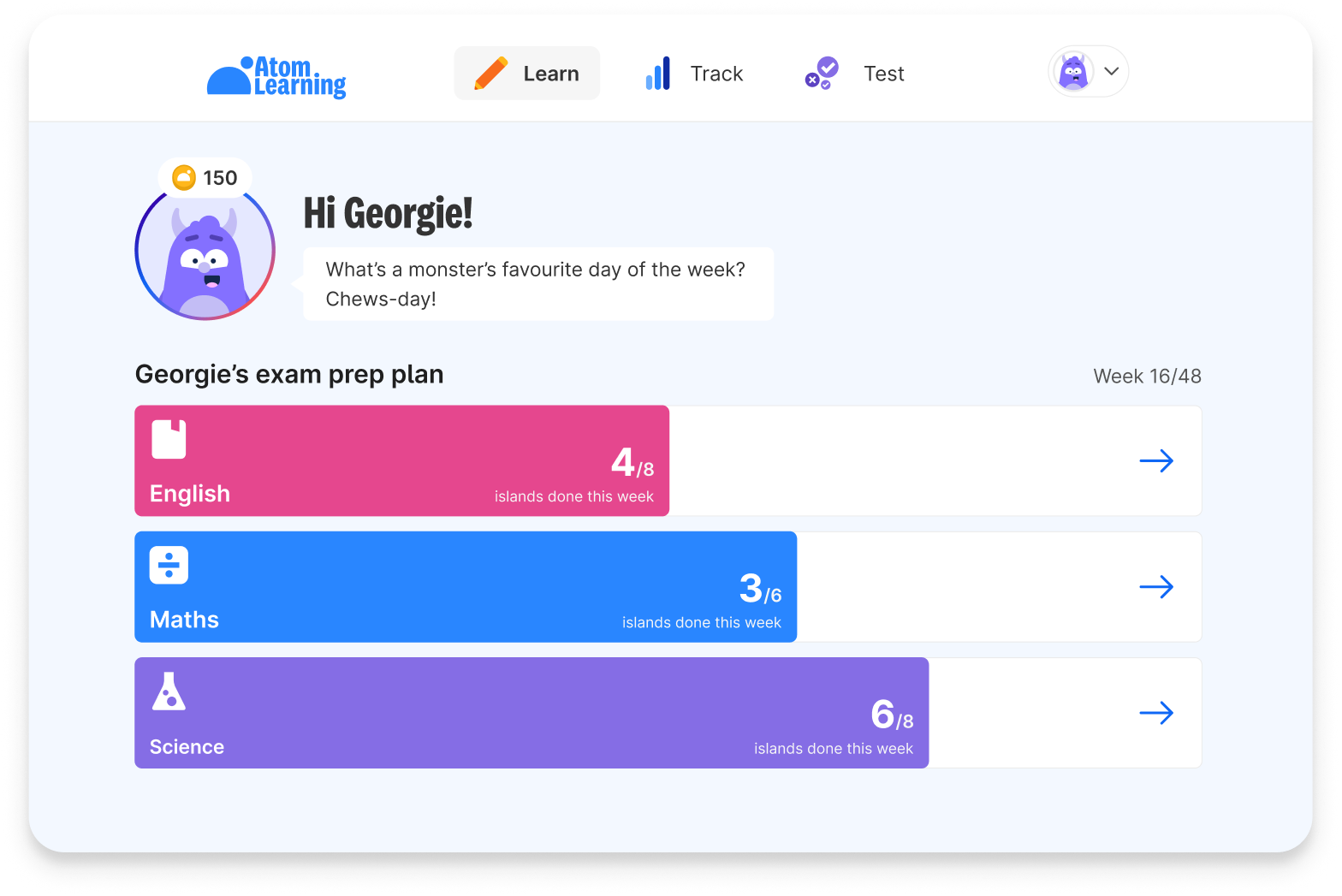 Each week, your child receives personalised learning goals. Atom tailors them to fill knowledge gaps and encourage them to try topics they’re struggling with.