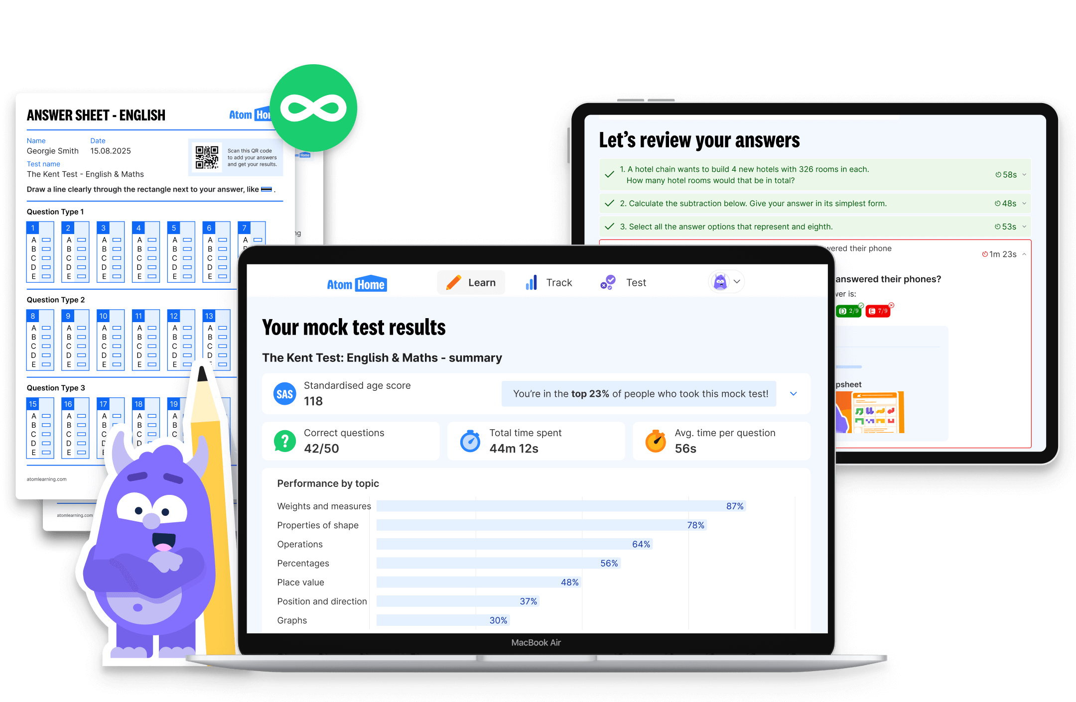 Atom’s unlimited 11+ practice tests are included in the Exam Prep Plus subscription (£69.99/month). This gives you: