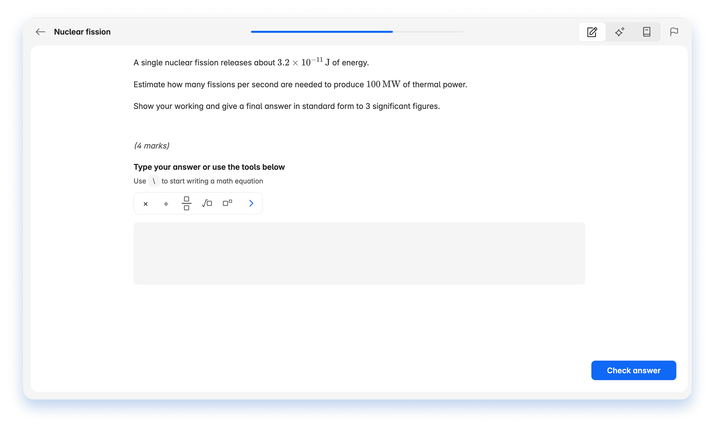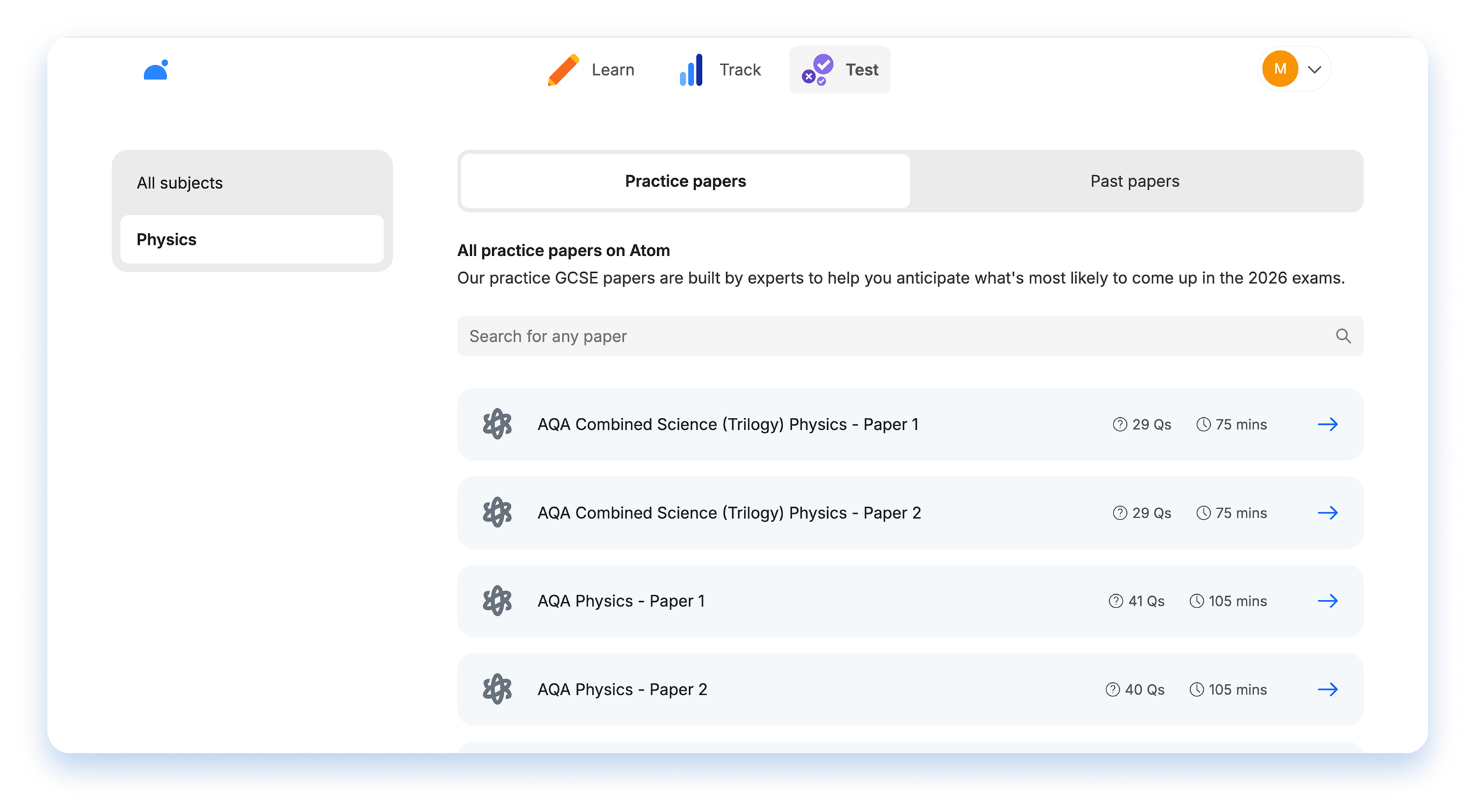 Atom Learning is an all-in-one GCSE Physics revision platform providing predicted practice papers, topic-by-topic questions, instant marking and grade tracking — all tailored to AQA, Edexcel and OCR specifications. Everything students need to revise effectively, in one place.