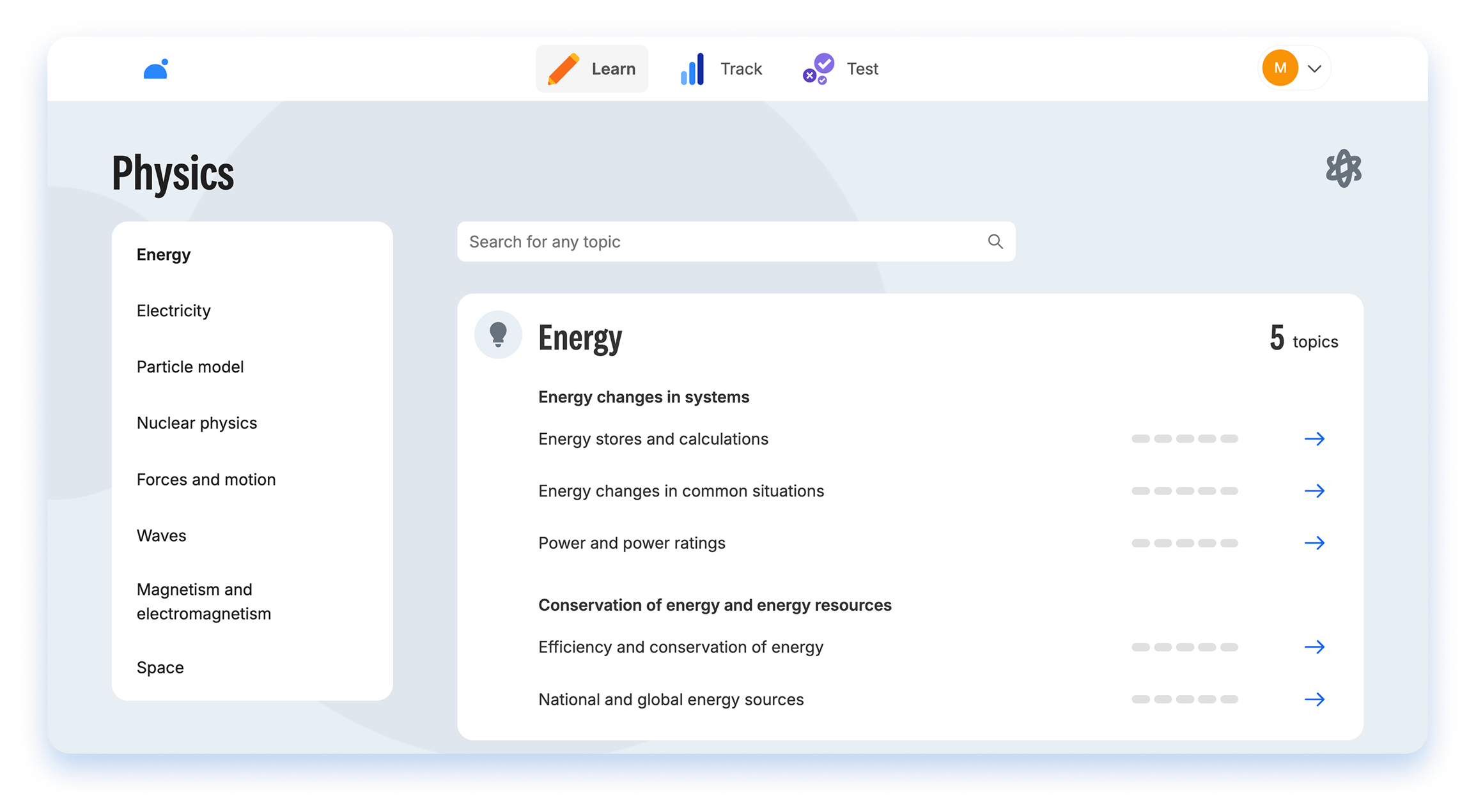 Atom covers the full GCSE Physics specification including energy, electricity, particle model of matter, atomic structure, forces, waves, magnetism and electromagnetism, and space physics. All topics are organised by the specification and matched to each student's exam board.