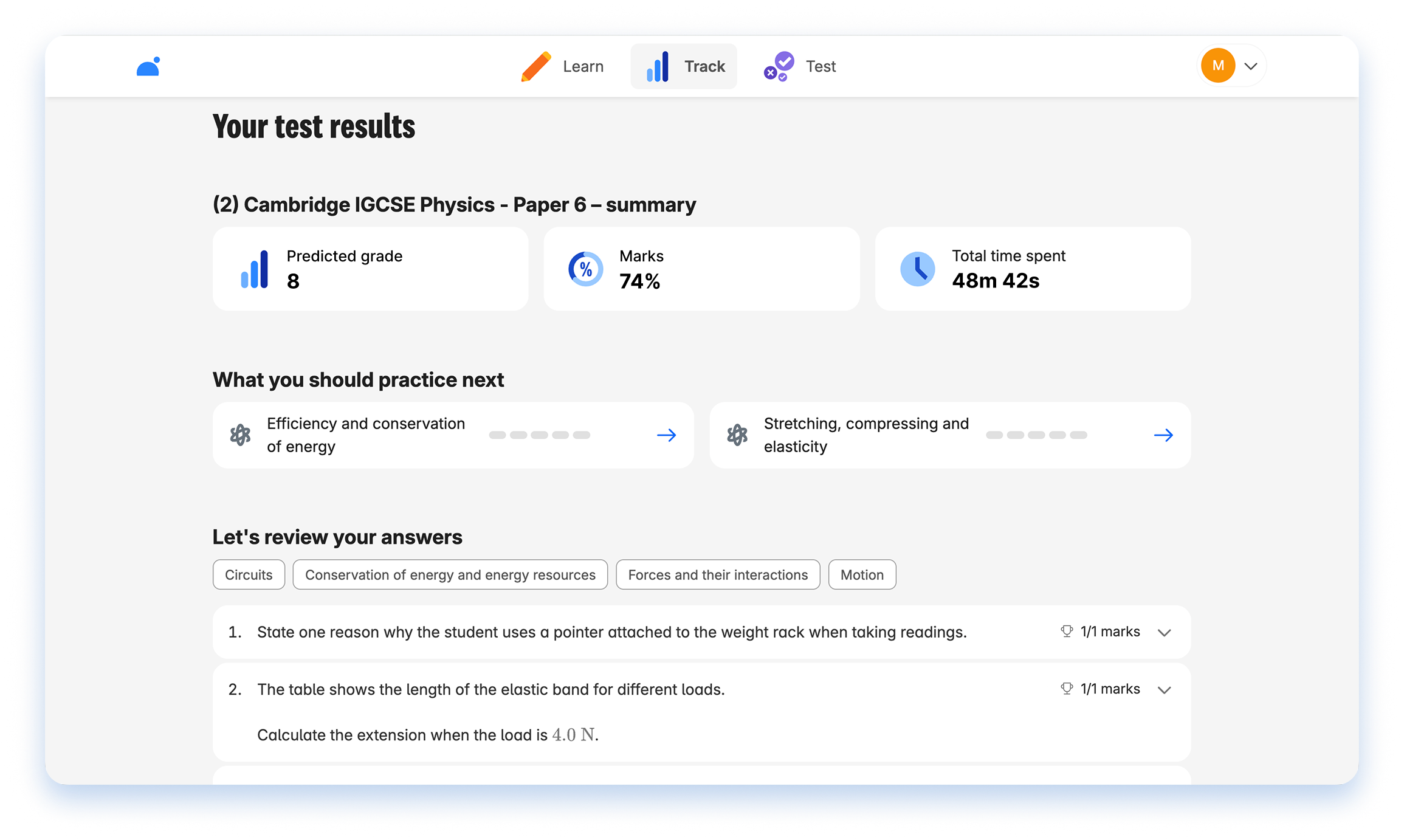 Atom predicts GCSE Physics grades based on performance in practice papers. Predictions are calculated using our team's forecasts for upcoming grade boundaries, so students always have an accurate sense of where they stand ahead of exams.